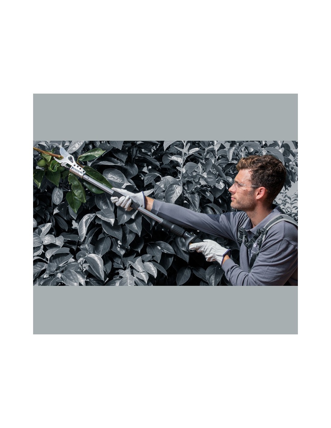 Sécateur pour la taille en hauteur, adapté aussi bien aux arbres fruitiers qu'aux plantes ornementales. l'un des avantages de cet outil est son excellent équilibre de poids, grâce au moteur et au réducteur placés dans la partie basse, ce qui permet une meilleure répartition par rapport à d'autres marques.